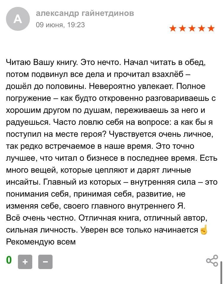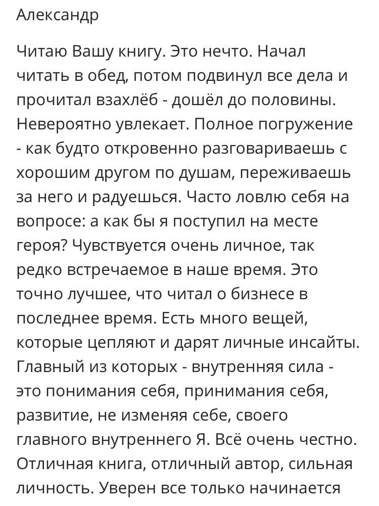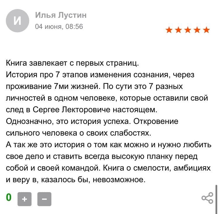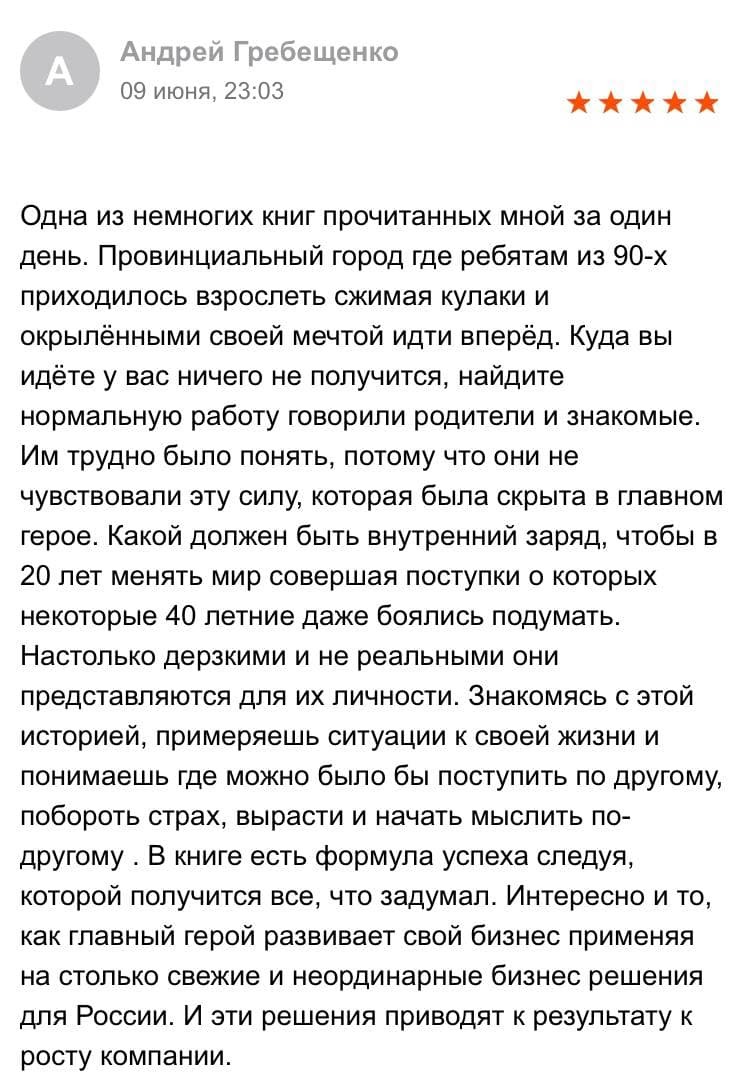 Больше всего в этой книге мне понравилась отвага Сергея и стремление быть номером 1 в любом деле, за которое он берётся. Этим качествам точно нужно учится любому менеджеру и предпринимателю в нашей стране, чтобы мы научились создавать конкурентоспособные бизнесы не только в России, но и во всем мире. А значит, и эту книгу должен прочитать каждый, кто претендует на роль настоящего созидателя.