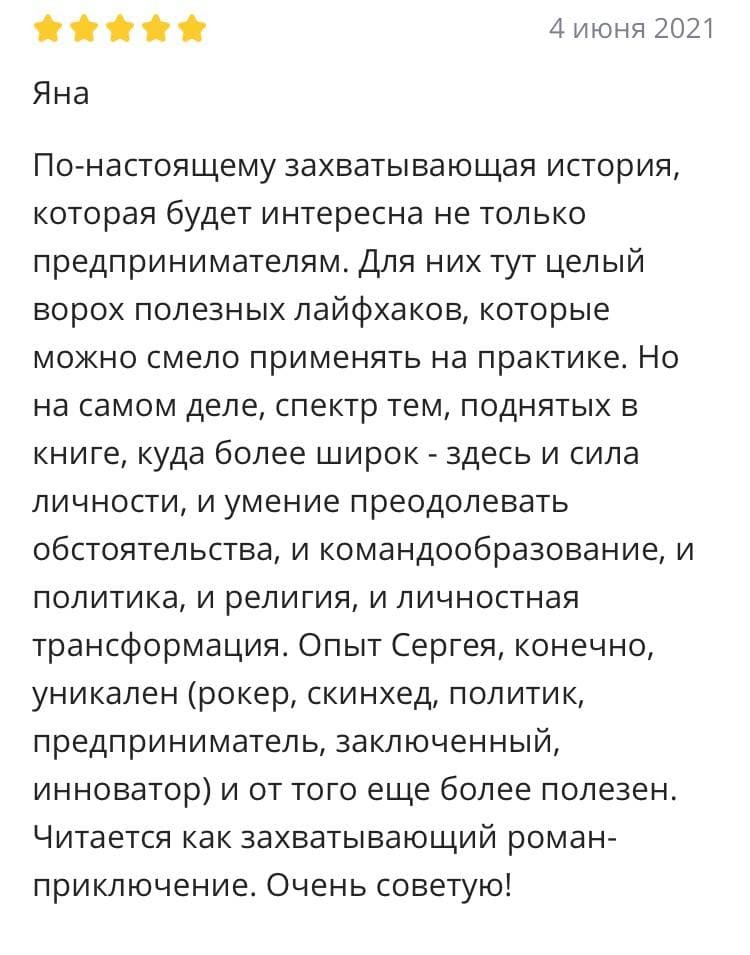 Увлекательное чтение. Исповедь предпринимателя и настоящего лидера, побывавшего в очень разных обстоятельствах: от главаря уличной группировки, через политику и тюремное заключение к успешному бизнесу. Прочел залпом, при этом нашел много полезного для себя лично